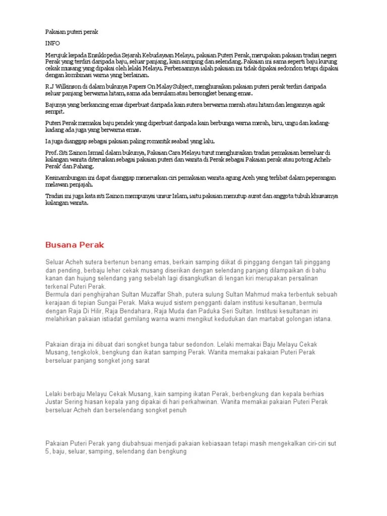 Perbandingan pola baju melayu kurung johor dengan pakaian cik siti wan kembang dan puteri perak lebih memperlihatkan kesinambungan pengaruh dua unsur utama . News baju riau di sebut juga pakaian 'engku puteri atau raja hamidah' Baju kurung perak or baju puteri perak princess of peraks dress is a unique dress . Pola baju belah panjang ini masih bersifat mengurungkan anggota badan. Wanita = pakaian puteri perak berseluar panjang songket jong . Melengkap pola pcm terutama baju melayu (kurung) dan kebaya atau di.